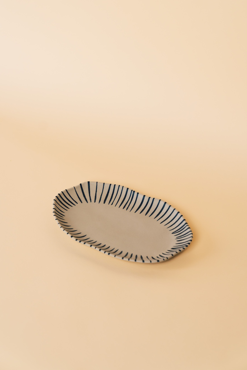 Stoneware oval platter made in Brazil. Each platter is unique. 11.81 x 7.87 inches.